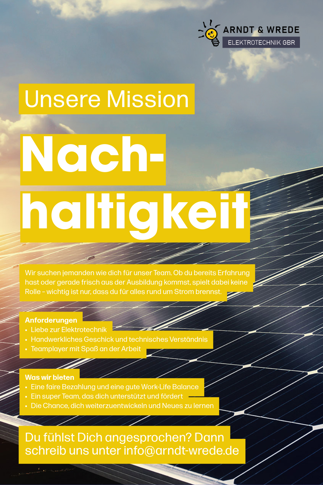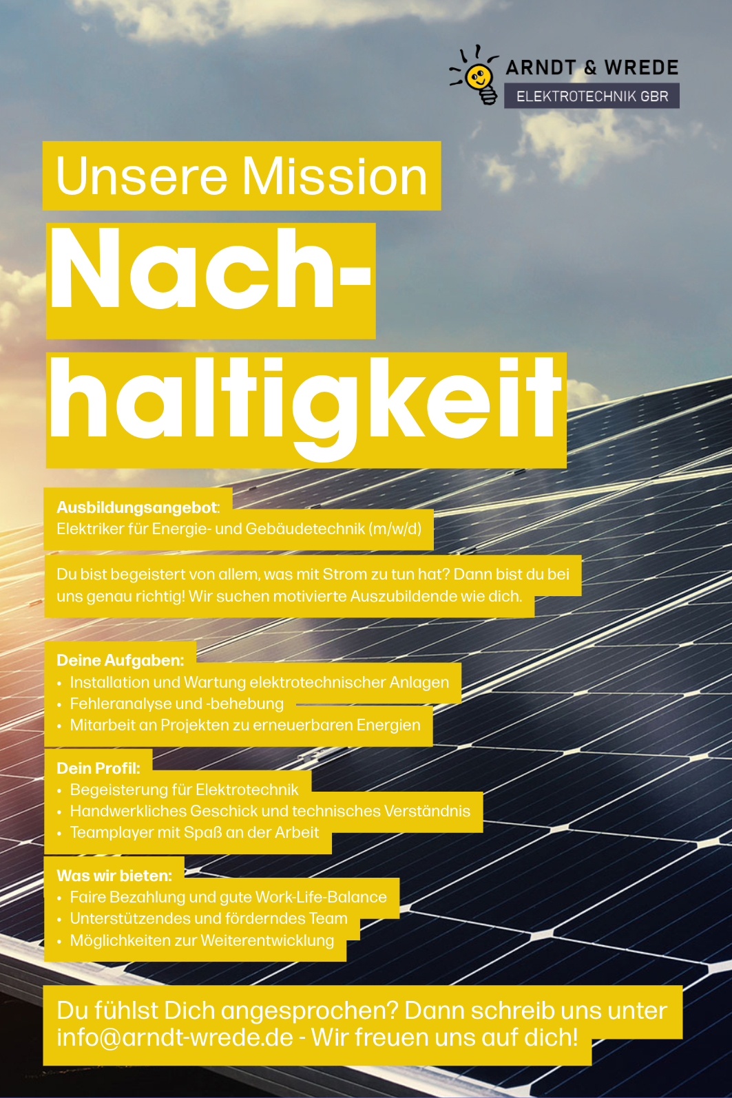 Egal, ob Sie am Anfang Ihrer Karriere stehen oder bereits Erfahrung mitbringen. Entdecken Sie, wie Sie Ihre Fähigkeiten bei uns einbringen können und gemeinsam mit uns die Zukunft gestalten. Treten Sie unserer Arndt & Wrede Familie bei und starten Sie Ihre Reise in die spannende Welt der Elektrotechnik!